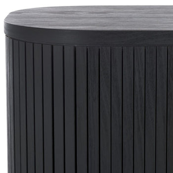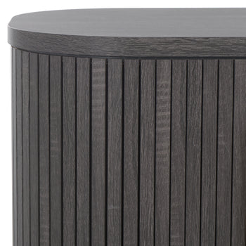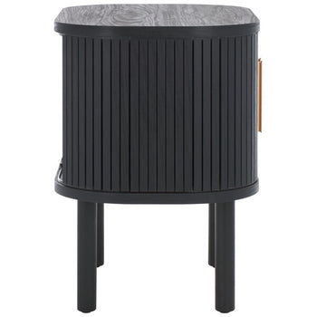 Elevate your bedroom with the dynamic style and functionality of our Tealla nightstand. Its linear profile and sleek rounded edges lend practical elegance and charm to any room. It features tambour doors on each side for added style and functionality. The gold pulls of the cabinet create a warm contrast with the rich finish of the nightstand. Perched upon wooden post legs, our sleek and stylish nightstand includes roomy cabinets to store and keep all your essentials within easy reach.
