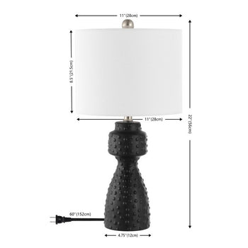 Liven up your decor with the stunning textures and charm of our Theory table lamp. Its sleek and sculptural silhouette is dotted with ceramic spheres to deliver fun and playful textures. Finished off with a black ceramic finish, the table lamp attains a sleek and chic presence. It adorns a white drum shade to filter soft and diffused light onto your tabletop. Our stunning table lamp can become an artful and eclectic focal point for your nightstand, console, or end table.