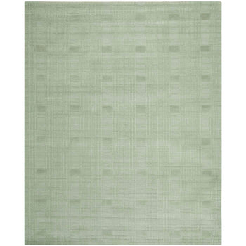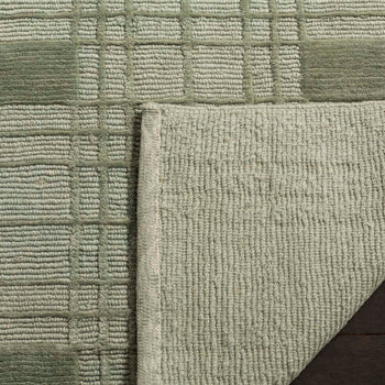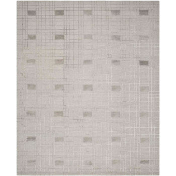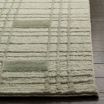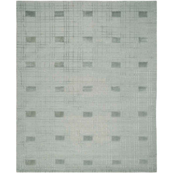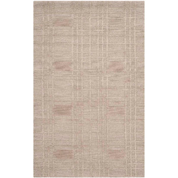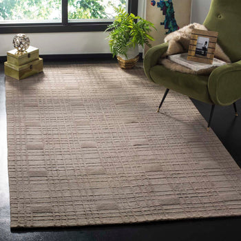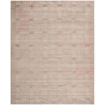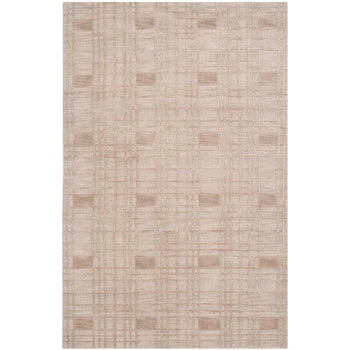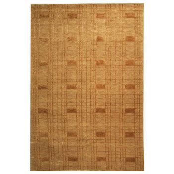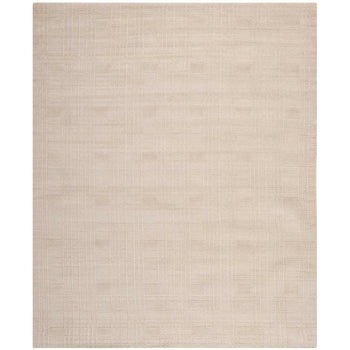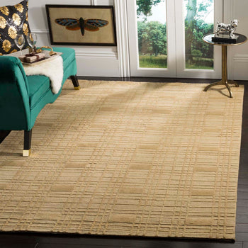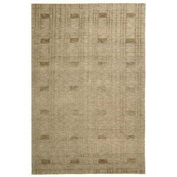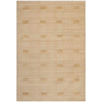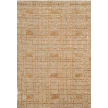 This subtle but graphic hand-knotted Tibetan rug by Safavieh recalls the understated elegance of Art Deco style. With a grid motif punctuated by plush squares, this transitional sand-toned high mountain wool rug gets its rich texture from a combination of loop and cut piles.