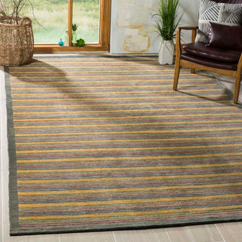 The rug's pattern, a subtle and intricate mix of color stripes, offers a contemporary aesthetic that can effortlessly complement a variety of interior designs. The medium pile height provides a plush underfoot feel while maintaining an easy-to-maintain surface. Transform your living room, bedroom, or office with this artisanal piece that is sure to become the focal point of your room. Enjoy the luxury of a handcrafted rug that brings both style and comfort to your home.