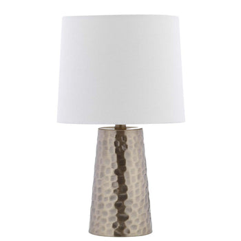 Update any living room with this contemporary table lamp. Crafted with a subtle texture highlighted by a plated gold finish, it casts a dramatic shimmering glow. An instant focal point, designers love the soft light diffused by its elegant shade.