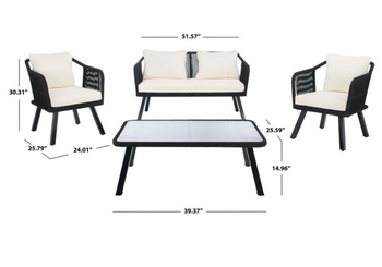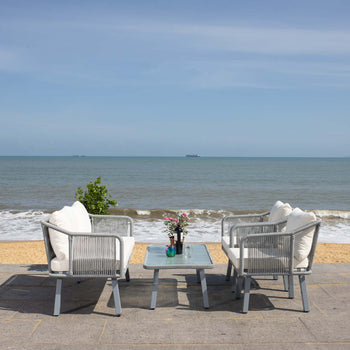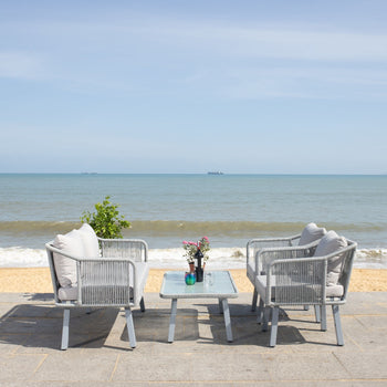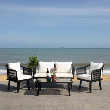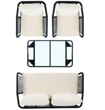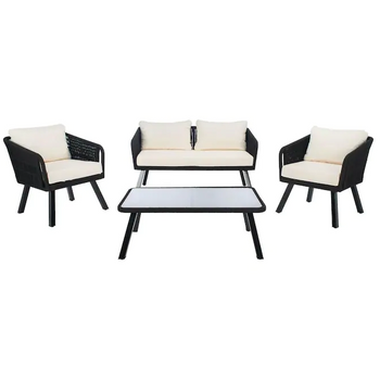 Modern minimalism gets a contemporary upgrade in this Torsla 4 Piece Outdoor Living Set. The geometric frames of Torsla's two chairs and loveseat are given a delightful, airy touch with grey rope details, while plush beige cushions provide matchless comfort in the great outdoors. Includes a glass topped coffee table.