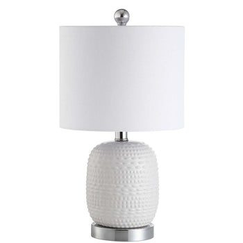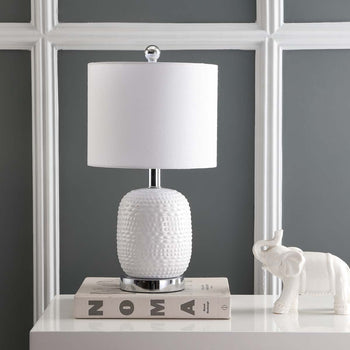 Inspired by contemporary sculpture, this artistic table lamp refreshes any living room or bedroom. Often used in pairs, its luxurious texture is highlighted by a bright white finish, paired with a chic silver base and a matching finial.