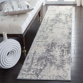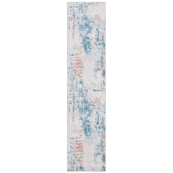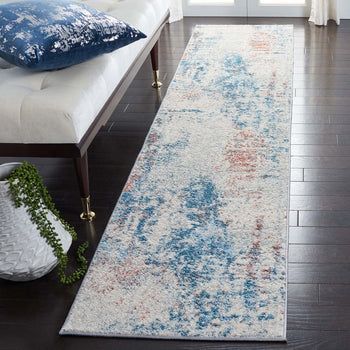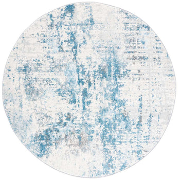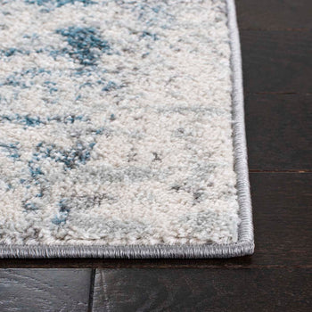 Colored in an elegant ivory melded with serene blue tones, the rug's pattern presents a modern abstract design that echoes the sophistication of an artisan brushstroke. Each texture and hue is thoughtfully balanced to elevate your living space with a touch of modern artistry.