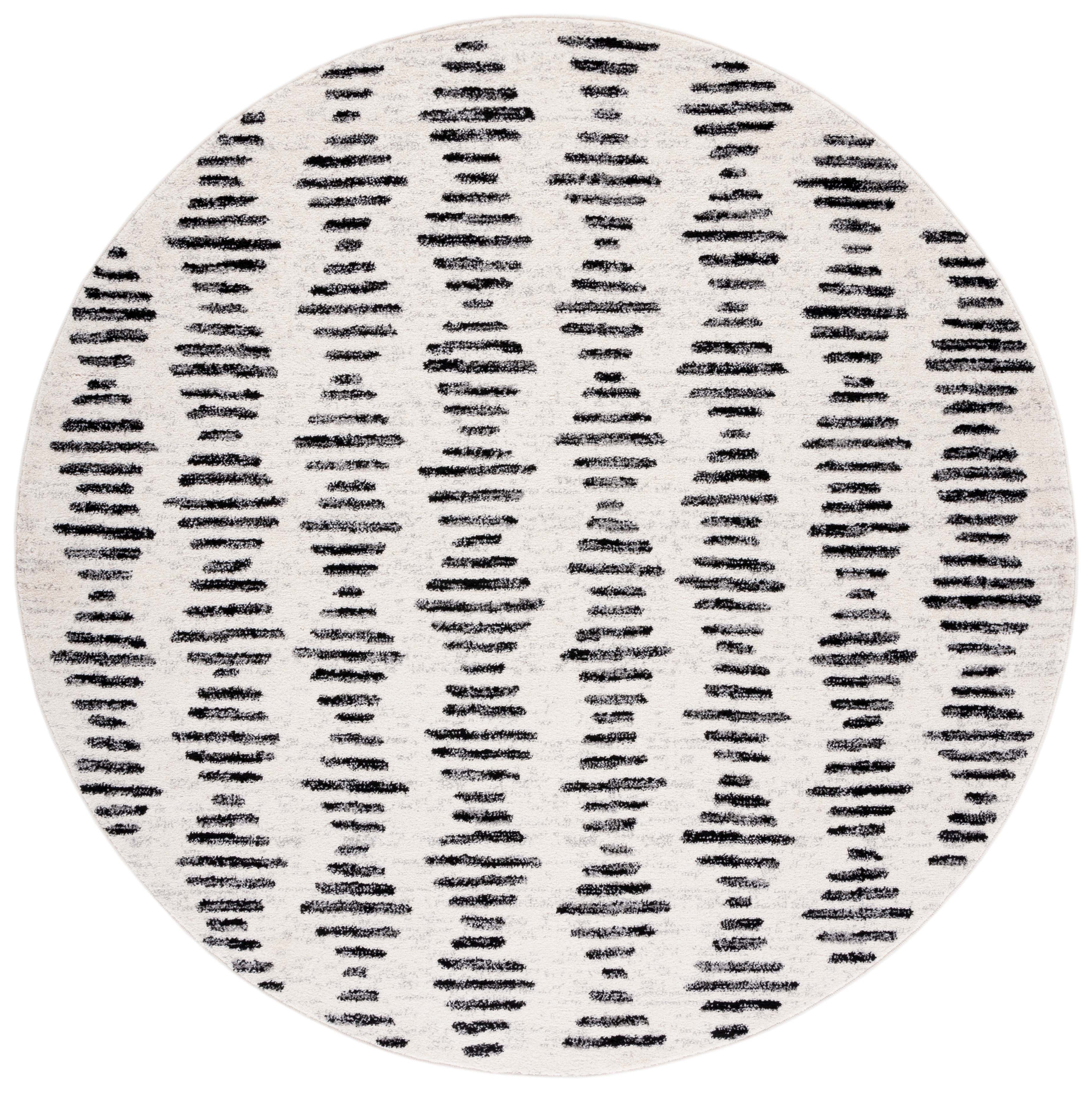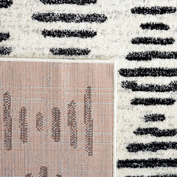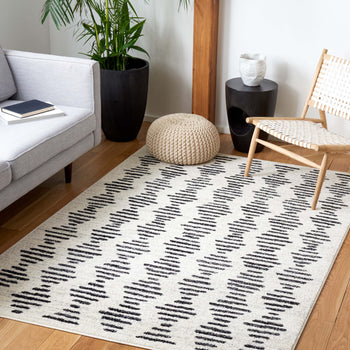 Showcasing an eye-catching Bohemian style, this rug features an abstract pattern that brings a touch of modern artistry to any room. The ivory and black hues create a striking contrast that draws the eye and complements a wide range of decor settings.