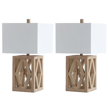 Make a bold statement in any room with the geometric lines of this contemporary table lamp. Its fine wood craftsmanship is illuminated by the soft glow of a complementary off white cotton shade held in place by a matching finial. Sold in sets of two.