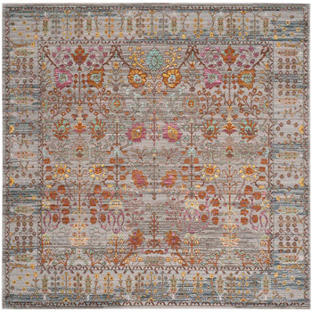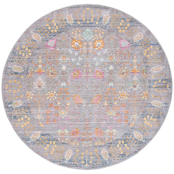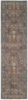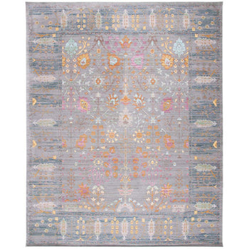The captivating pattern of the rug draws inspiration from traditional designs, showcasing intricate details and a variety of shapes that create a visual feast for the eyes. The symmetrical layout and subtle distressed effect add a touch of vintage elegance to the piece, while the vibrant pops of color woven into the grey background give it a modern twist that is sure to complement a range of interiors.