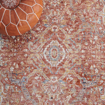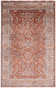 Traditional design and fashion-forward styling come together in a collage of color in the Valencia Rug Collection. Saturated hues pop from these overdyed rugs. A lustrous patina lends an expressive look the suggestive motifs. Made using soft synthetic yarns with serged edges for a designer-look finish.