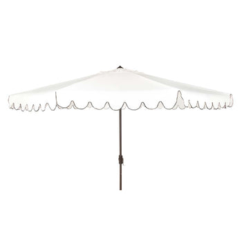 The signature white and blue coloration of Santorini's lush legendary resort inspired this eleven foot crank umbrella. Its sophisticated navy hue features a scalloped white trim to create an outdoor retreat for the modern tastemaker.