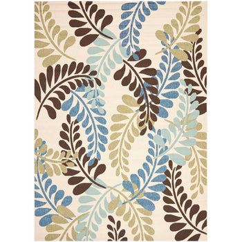 Elevate your home decor with the elegant design of our indoor/outdoor area rug, sized 2 feet 7 inches by 5 feet to fit a variety of spaces. The small rectangular rug in cream and aqua boasts a charming pattern featuring an array of delicate leaves in soothing shades of blue, green, and brown, creating an inviting atmosphere in any room.