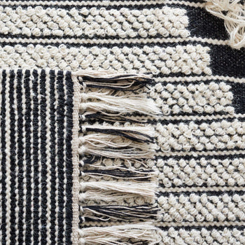 The versatility of the black and ivory color palette along with its abstract design gives you the freedom to introduce this rug to any room, setting the stage for a refined aesthetic that is both appealing and practical. Embrace the harmony of sophisticated design and fine Indian craftsmanship with this unique area rug.