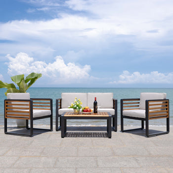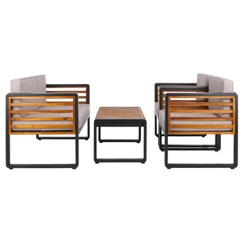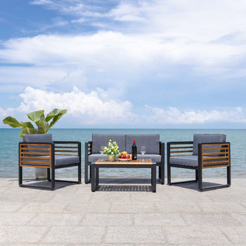 Introducing the VESTA 4 PC Outdoor Living Set ? your perfect choice for relaxing and entertaining outdoors. This stylish and versatile set features a harmonious blend of colors with black steel frames, natural wood accents, and light grey cushions, creating a chic and contemporary look for your patio, deck, or garden.