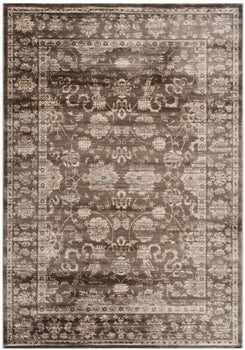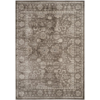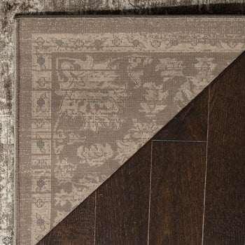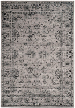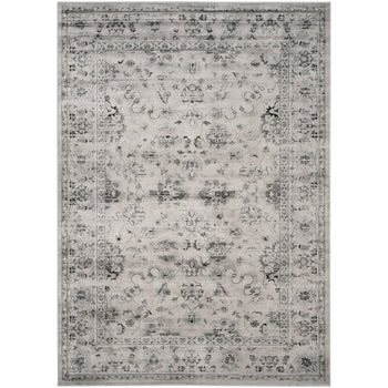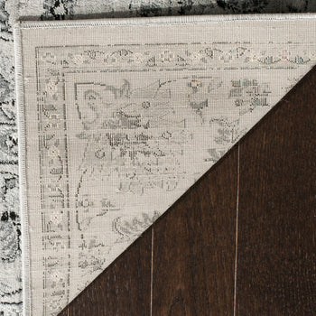 The rug reveals an intricate pattern that harks back to classic design elements, featuring floral motifs and ornate borders, masterfully faded for a charming vintage aesthetic. The seamless blend of traditional patterns with a modern grey and ivory color scheme complements both contemporary and classic interior styles, making this area rug a versatile addition to any home.
