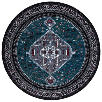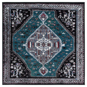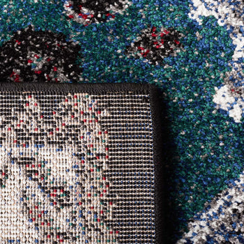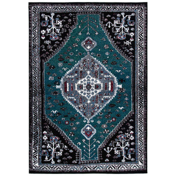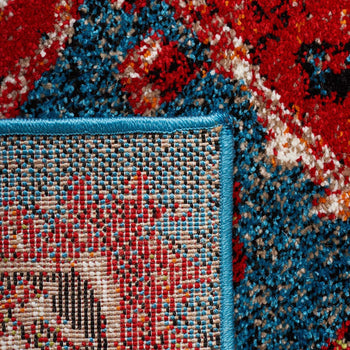 The rug showcases a dynamic Transitional style, woven from durable polypropylene that accommodates high traffic while maintaining its vibrant turquoise and red hues over time.