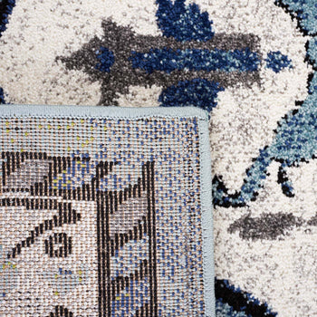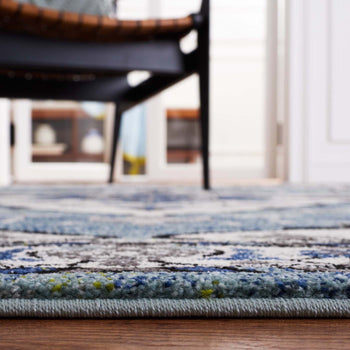 The harmony of blue, green, and ivory hues artfully interwoven creates a serene yet sophisticated canvas for your floor. Detailed with a medley of ornate motifs and framed with an intricate border, the rug's design conjures visions of ancient palatial opulence married seamlessly with modern aesthetic sensibilities.
