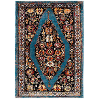 The rug's pattern, depicted in the image, showcases intricate motifs and a central diamond medallion, surrounded by detailed floral elements and bordered with a harmonizing design. The rich, plush pile height of 5/8 inches underfoot provides comfort and warmth, inviting you to enjoy every step.