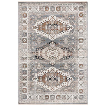 With its soothing palette of grey and cream, this rug introduces a serene ambiance to any room. The traditional style is embodied through intricate patterns that echo timeless elegance and sophistication. Noteworthy design elements include ornate central medallions, framed by detailed borders that showcase floral motifs and geometric accents.