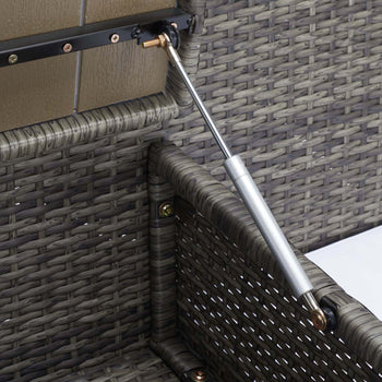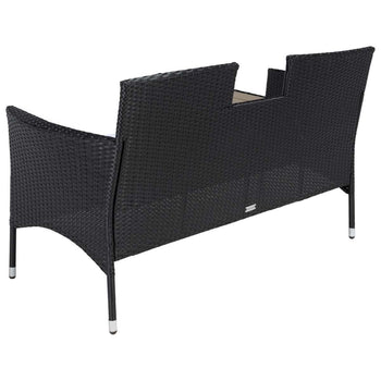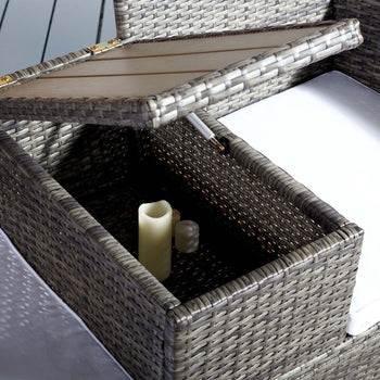 Form meets function for outdoor living in this Viora Loveseat. Viora's subtle curves and clean lines are wonderfully highlighted by its modern black wicker details and plush white cushions, and a built in box with a gas lift provides discrete storage on the porch or patio.