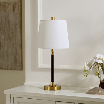 Introducing Vitale, the 22 inch table lamp designed to elevate your living space with elegance and sophistication. This lamp combines the striking contrast of black and brass, adding a touch of modern flair to your home decor. Crafted from durable iron, this piece offers a sturdy and sleek addition to any room.