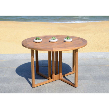 An exotic resort in Bali inspired this contemporary 47.24 inch round dining table. Crafted in a natural hue, its bold geometric style blends into any outdoor living area. Ideal for entertaining at extended family gatherings or a candlelight dinner for two.