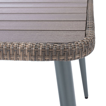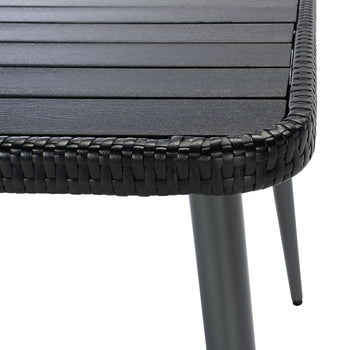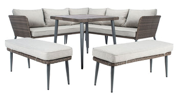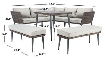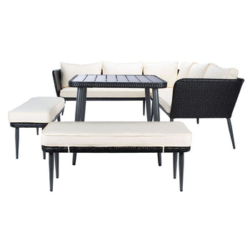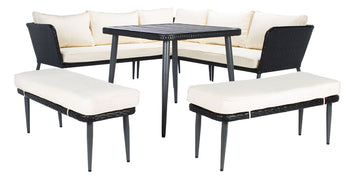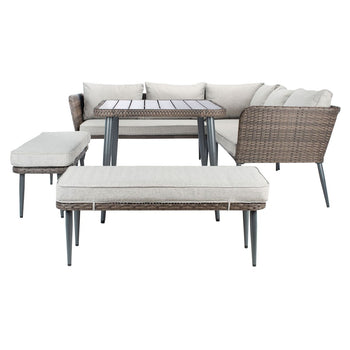 This Warten 6 Piece Sofa Set is perfect for bringing any party outdoors. Two benches, two loveseats, and connecting corner piece boast striking contrasting angles in black woven rattan that pair beautifully with Warten's high style dining table, and soft beige cushions ensure hours of cozy outdoor entertainment.
