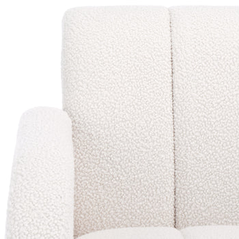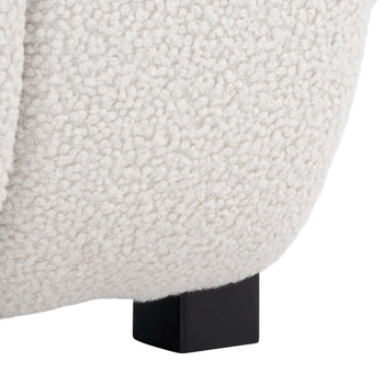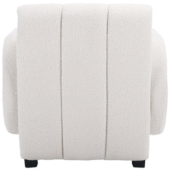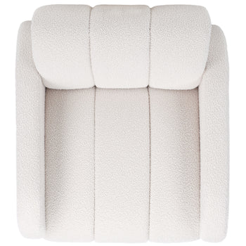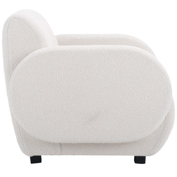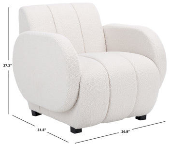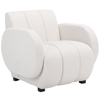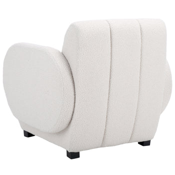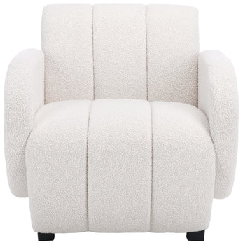 Embrace a cozy and plush respite with our stunning Waylen accent chair. The curvaceous profile and voluminous contours of our chair vouch for a sculptural and statement-making appeal. Its plush cushioning is accentuated with a neat channeling detail. Featuring a deep seat and padded arms, our accent chair remains the perfect spot to relax and lounge. It is upholstered in the rich textures of boucle in a versatile off-white hue to bring cozy comfort and style to your living area or bedroom.