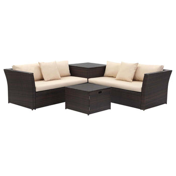 Entertain with ease with this contemporary outdoor living sectional sofa set with storage. Each piece is designed with sleek angles, and seating features a raised back with plush beige upholstery for instant relaxation. Designers love its ample hidden storage.