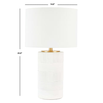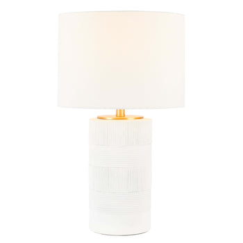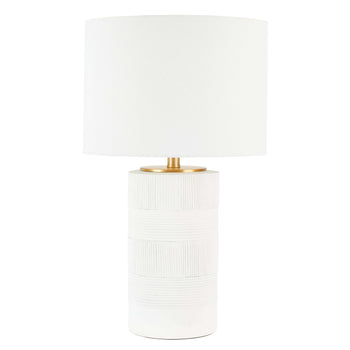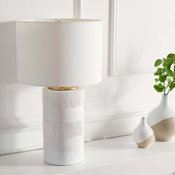 Give a chic and classy update to your home with the Weller table lamp. The sleek lamp captures the eye with its artisanal texture. Creating the perfect contrast, the drum shade and white resin body come together to feature as a modern and striking accent for your home. The table lamp delivers softly diffused light to add warmth and character to your bedside, desk, console, or end table.