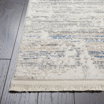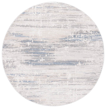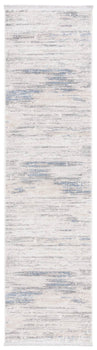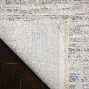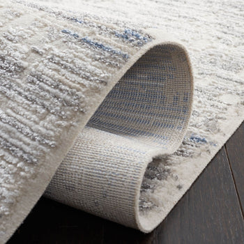 The rug showcases a harmonious blend of grey and blue hues that create a serene and versatile backdrop for any room. Its contemporary design features a distinct pattern that mimics the gentle flow of brushstrokes, lending an artistic touch to its modern style.