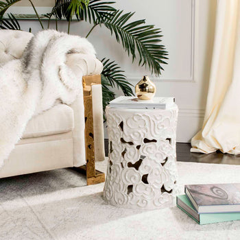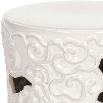 Intricately detailed, the Cloud Garden Stool is crafted of high fired ceramic with a lustrous white glazed finish. Used in Chinese gardens for centuries, the flowing motif of stylized swirling clouds adds rich texture and visual interest both indoors and out.