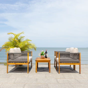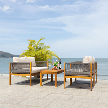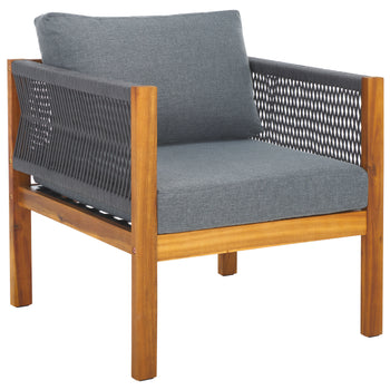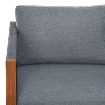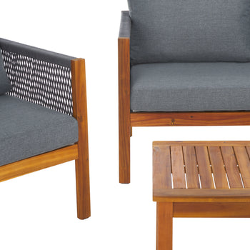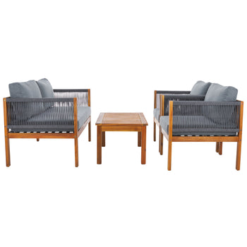 Bring modern and breezy charm to your outdoor living space with our Wilson 4 piece living set. Including a two-seater sofa, two accent chairs, and a table, our outdoor living offers casual elegance and comfort. It is crafted from acacia wood to lend warmth and rich textural appeal to our modern and clean lined living set. The sheltered silhouette of the sofa and chair is covered with Allweather rope to attain a breezy appeal. It is complemented with light grey plump back cushions and a boxy seat to promise a comfortable stay. Our modern and breezy outdoor living set allows fresh air lounging all year round.