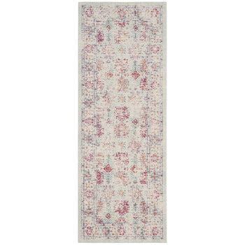 The rug showcases a stunning pattern with a distressed ivory base, punctuated by pops of fuchsia and subtle hints of other colors, creating a faded vintage look that can complement both modern and classic decors. The intricate design highlights traditional motifs that have been reimagined for contemporary tastes, giving your space an inviting and stylish atmosphere.