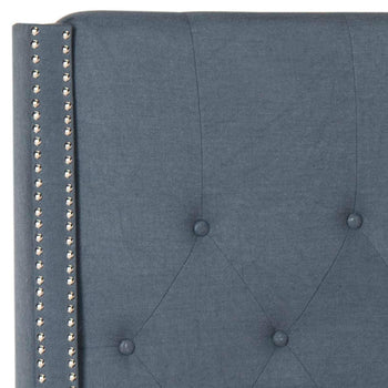 A handsome focal point for transitional bedrooms, this lavishly upholstered bed is covered in luxurious navy blue linen. Quilted to perfection and finished with silver nailheads, the tall headboard and posh frame are accented by feet in espresso.