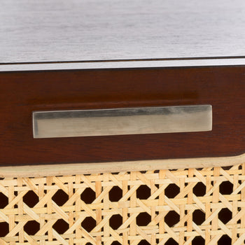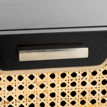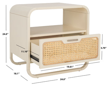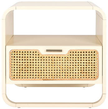 Enliven your home with the breezy and inviting presence of our Yates nightstand. The nightstand beautifully celebrates contrasting materials and textures in an airy profile. Woven rattan panels upon the drawer add a dose of warmth and textures, creating a beautiful contrast with its sleek finish. Crafted in rubber wood, our nightstand is finished off with sleek curves and tailored pulls for a chic and inviting appeal. It includes a roomy drawer and an open shelf to keep all your nighttime essentials organized.