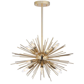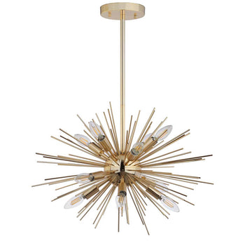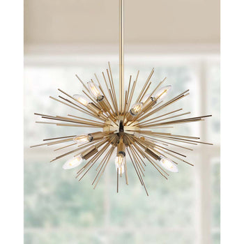 Bursting with space age style, this contemporary pendant brings a retro vibe to any dining room, living room or foyer. Finished in gold, its metal design pairs a vibrant starburst sculpture with Sputnik inspired lights to create a dynamic focal point.
