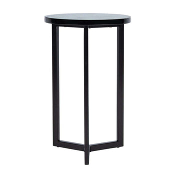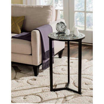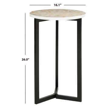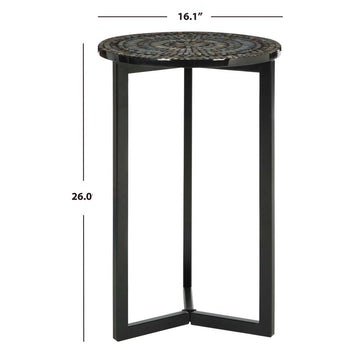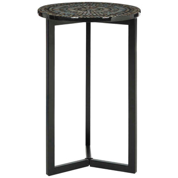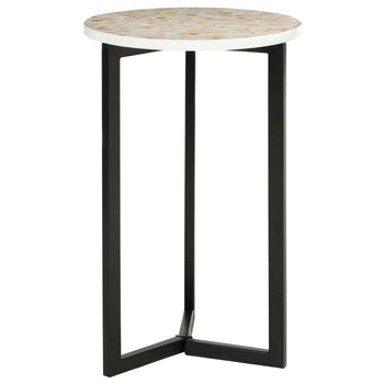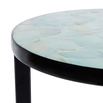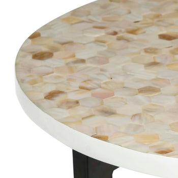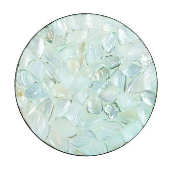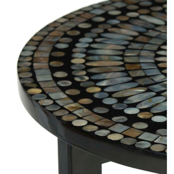 This intriguing end table was designed after a journey through Bali to examine the tradition of the shell mosaic work. Our homage pairs a cream mother of pearl inlay and lacquer top with a modern black base.