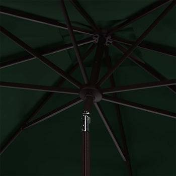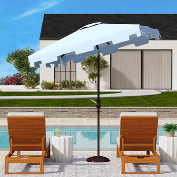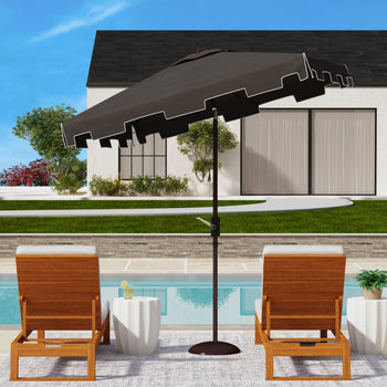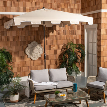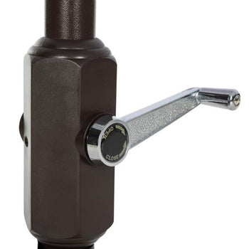 A classic market umbrella gets a chic makeover in forever fashionable colors with a stylish valance for extra sun protection and European flair. Its square polyester canopy and aluminum post make it ideal for the veranda or pool deck. Includes easy crank and tilt mechanism.