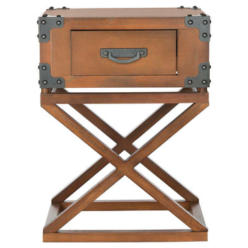 A clever melange of British campaign furniture classics, this Dunston side table is a conversation piece that provides storage and style. Outfitted with steamer trunk corner reinforcements, this pine table is finished in warm brown.