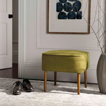 A petite footstool with natural oak finished legs inspired by Mid Century Modern chairs, the Eli Ottoman is ideal for the small bedroom or cozy apartment living room. Covered in a sweet pea green viscose blend, Eli is fabulous tucked beneath a console or in pairs flanking a sofa.