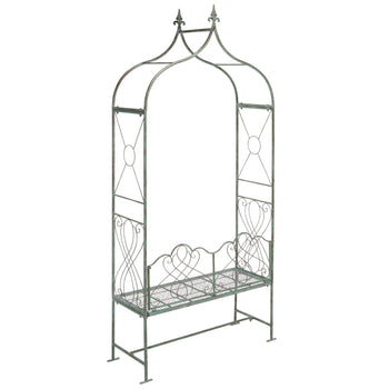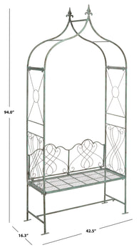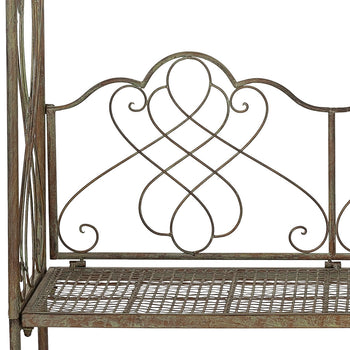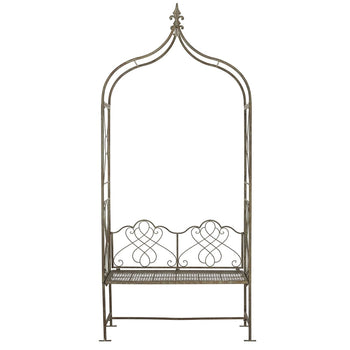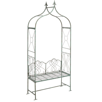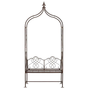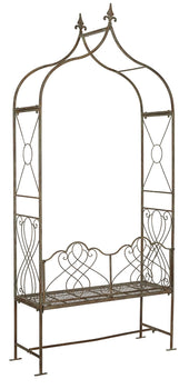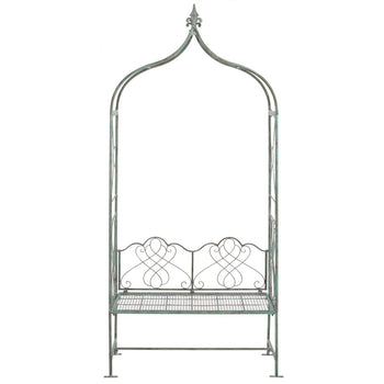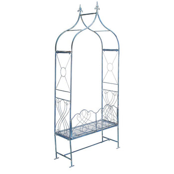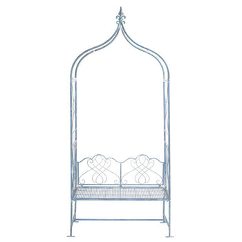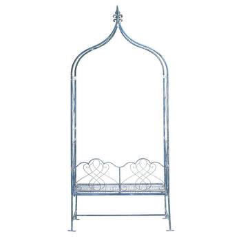 A whimsical combination of a loveseat and garden arch, this Eloise Arbor boasts classic English style. Eloise's rustic blue iron proves the perfect foil to its intricate Victorian scrollwork and fleur de lis finials, giving your outdoor space an air of enchantment and elegance.