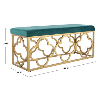 Traditional class meets modern glamour in this fabulous Fleur Bench. Fleur's open quatrefoil design brings airy elegance the entryway, living room, or master suite. Shimmering in a gold liquid finish and cream velvet seat, Fleur seamlessly enriches the color scheme of any decor.