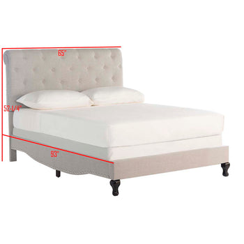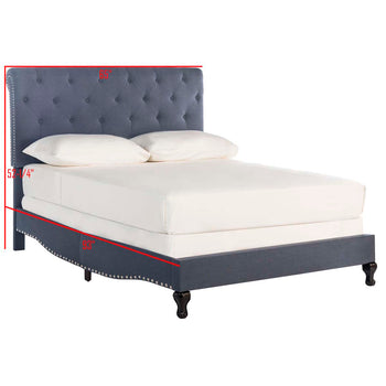 Get the look of a bespoke designer bedroom with an exquisite fully upholstered bed covered in crisp navy blue linen. Its curved sides, rolled button quilted top, black finished feet and oversized silver nailheads recall French grandeur.