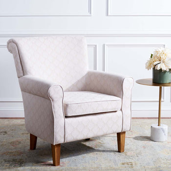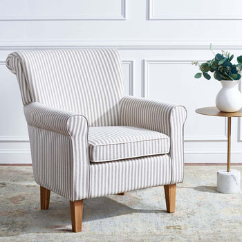 The Classic Roll Arm Of The Hazina Club Chair Gets Updated Thanks To A Modern Beige Stripe Pattern In A Luxurious Blend Of Linen And Viscose. Standing Atop Espresso-Finished Legs, Hazina Is Glorious In The Living Room, Family Room, Or Master Suite.