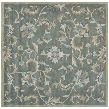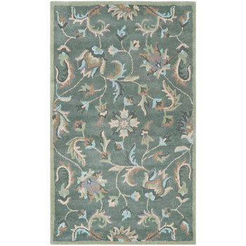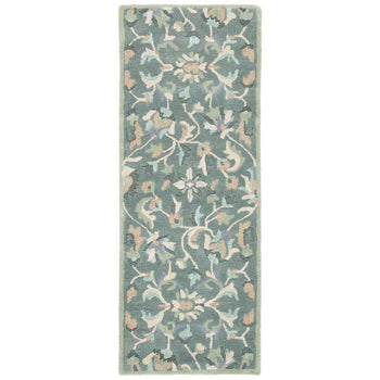 The rug showcases a traditional pattern that features intricate florals and scrollwork. The design weaves in subtle tones of blues, greens, and neutrals, creating a harmonious blend that complements both modern and classic interiors. The borders are thoughtfully designed to frame the pattern, adding a finished look to this piece.