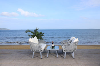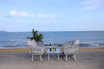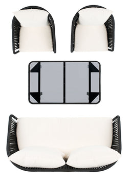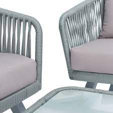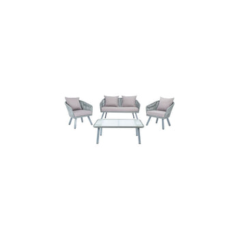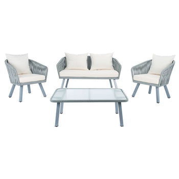 Flaunting familiar silhouettes in its two armchairs and loveseat, this Jorda 4 Piece Living Set revitalizes classic design for today's patio or backyard Decor. Jorda's grey rope details beautifully mimic the airiness of the great outdoors, while its glass topped coffee table provides ample space for cocktails or canapes.