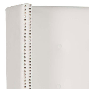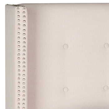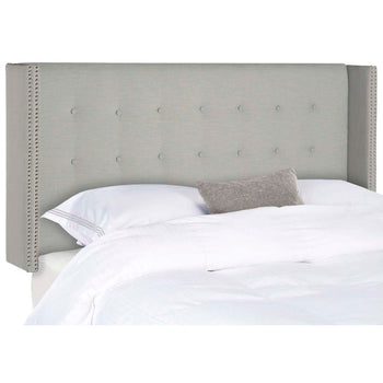 Inspired by the personal haven created by a famed Belgian collector of art and antiquities, this winged headboard transforms a bedroom into a sanctuary. Upholstered with luxurious tufting and silver nailhead trim, it's the essence of tranquility.