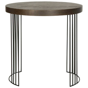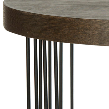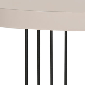 A nod to plane geometry, the round Kelly Side Table creates a crisp contemporary statement beside a sofa or chair. This chic table is crafted with two half circle rows of black iron hairpin legs and a lacquer or woodtop for luxurious shine.