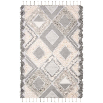 The rug presents a sophisticated geometric diamond pattern that interplays the soft ivory and elegant grey tones, lending a contemporary yet timeless look to any room. Each design element is raised, casting intriguing shadows and providing a tactile experience that encourages touch.