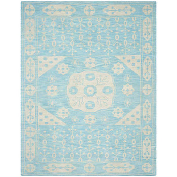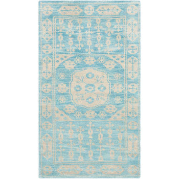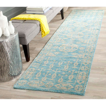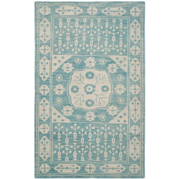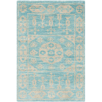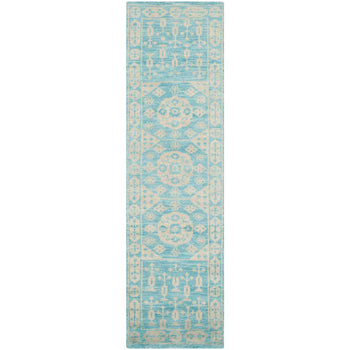 Crafted using the time-honored hand-knotted technique, each rug is unique, with subtle variations that imbue your space with an artisanal touch. Whether anchoring your living room furniture or nestled under a console, this rug's serene pattern and gentle blue hues create a peaceful backdrop for your day-to-day living.