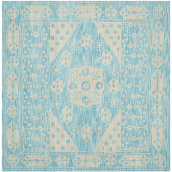 The rug features a captivating pattern, with a serene palette of blues that bring calm and tranquility to any room. Intricate traditional motifs grace the rug, inspired by timeless designs that have adorned elegant homes for centuries. The intricate details and symmetrical arrangements speak to the skilled artisanship of its Indian heritage.